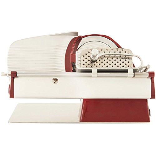 Si tratta di un’affettatrice decisamente curata e disegnata per avere un’estetica piacevole ma anche studiata per essere pratica e decisamente funzionale. Il design vintage originale e innovativo permette alla macchina di essere un oggetto di arredo. Inoltre le dimensioni molto compatte ne fanno una macchina perfetta per l’uso domestico in cucina. Queste caratteristiche sono accompagnate da un motore decisamente potente che consente un taglio netto e preciso quasi al pari con macchine professionali. La struttura oltre che futurista risulta molto stabile grazie al piano di acciaio posto alla base che controbilancia il peso del motore e del carrello. I materiali della struttura giustificano ampiamente il prezzo. Inoltre ogni più piccolo particolare è disegnato anche per andare incontro alla praticità. Le linee non presentano spigoli o spazi difficili da pulire, proprio per poter rendere questa macchina igienicamente perfetta. Il piano inclinato è un aiuto per poter ottenere un risultato maggiore. Grazie alla gravità gli alimenti verranno affittati in minor tempo e con il minimo sforzo. Il pressa-alimenti in metallo è di alta qualità, sicuramente l’ideale sia per ottenere un taglio pulito sia per preservare le dita durante l’uso. La pulsantiera Led è decisamente ergonomica e intuitiva da usare, come anche la manopola di regolazione.