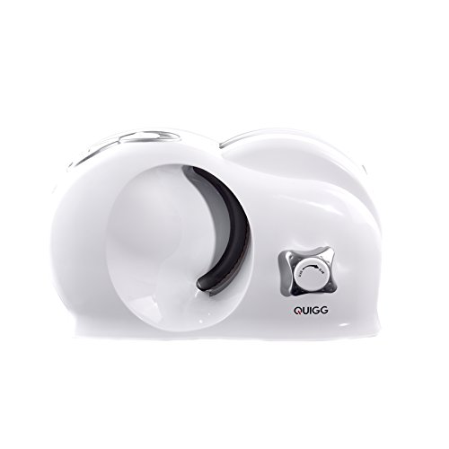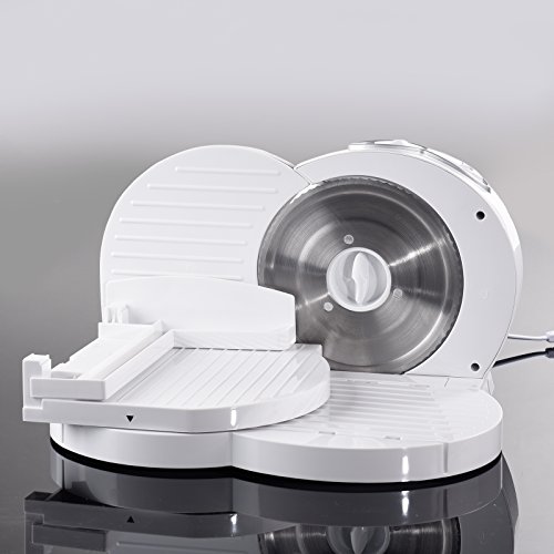 Si tratta di un’affettatrice molto compatta e richiudibile. Riesce ad occupare uno spazio decisamente piccolo, e può essere riposta tranquillamente in un cassetto. Questo suo lato positivo la rende una macchina che si adatta piacevolmente ai bisogni di una cucina. Non può essere considerata professionale o semi-professionale, per via della struttura e delle dimensioni ristrette. Ottima per tagliare cibi morbi, frutta, verdura e pane. Non è indicata per cibi troppo duri. La lama si smonta facilmente, questo permette una maggiore pulizia e igiene di tutto il corpo macchina. Il motore è abbastanza silenzioso ma non è potentissimo. Presenta anche delle accortezze di sicurezza che ci aiutano nell’utilizzo. Ad esempio abbiamo sia un pressa-alimenti che preserva le nostre dita dalla lama sia un sistema di azionamento di sicurezza. Il design estroso la rende un affettatrice irriconoscibile se chiusa. La lama in acciaio inox da 17 cm di diametro permette di tagliare in maniera piuttosto regolare. Lo spessore di questa macchina affettatrice può essere regolato da 0 a 15 mm, perciò ideale anche per tagliare il pane. Oltre ai blocchi di sicurezza troviamo dei comodi piedini a ventosa che ci consentono l’uso in totale sicurezza, e la stabilità e la precisione nel taglio.