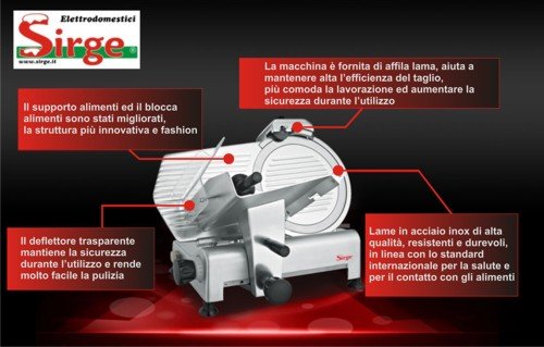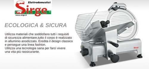 L’affettatrice professionale Sirge AFFPROF25 semi-automatica ha un design studiato per essere pratica ed ergonomica durante l’uso. Il motore molto potente e la struttura ben salda la rendono un attrezzo ideale anche al di fuori della cucina domestica. Ideata per un uso continuativo ha diversi accorgimenti che permettono che il motore non si surriscaldi, e una presa di sicurezza adatta agli esercizi commerciali e industriali. Inoltre presenta un affilatoio, utilissimo per mantenere la lama sempre ottimale e il taglio regolare anche col passare del tempo. Tutto questo unito alle dimensioni abbastanza ridotte ne fanno un oggetto utilissimo anche in ambiente domestico, che garantisce di poter dare ottime prestazioni su qualsiasi tipo di cibo.
